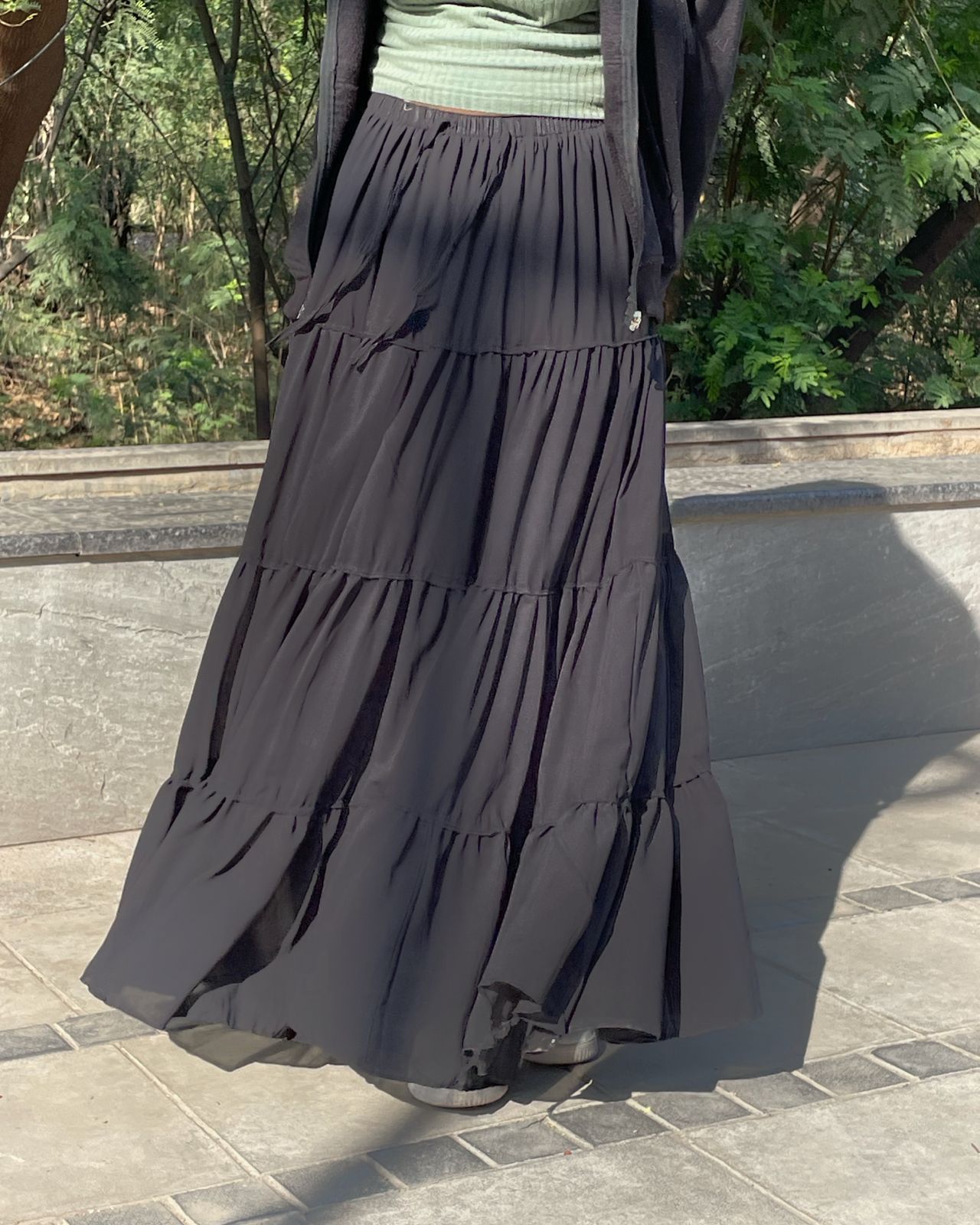 Our Black Maxi Skirt is the epitome of versatile elegance. Crafted from luxurious chiffon, it offers a flowing, graceful silhouette that moves beautifully with every step.